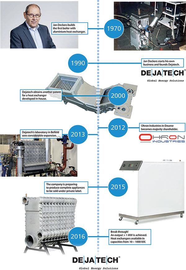 دژاتک اسمی است که سـالها با مشخصههای کیفیت و قابل اعتماد بودن در بازار جـهانی مـطرح مـیباشـد. در حال حاضر بیش از نیمی از بویلرهای موجود در اروپا از تکنولوژی انحصاری دژاتک استفاده میکنند. آقای جان دکرز بنیانگذار شرکت دژاتک یکی از پیشگامان طراحی بویلرهای مرکزی راندمان بالا که انقلابی در این صنعت ایجاد کرد میباشد. دژاتک در طول سالیان متمادی پیشگام توسعه، نوآوری در طراحی و خلق طرحهای خلاقانه در صنعت گرمایش بوده است. طی سال 2015، این شرکت 9 اختراع (Pantent) را به ثبت رسانده است که بر این اساس کیفیت تولیدات همواره در حال بهبود است. دژاتک دانش فنی مهندسی خود را به شرکتهای دیگر بسط داده و زمینه رشد و توسعه در صنعت گرمایش را فراهم آورده است. در حال حاضر در صنف جهانی تاسیسات، نام دژاتک به معنای نوآوری و کیفیت میباشد. از اینرو این شرکت به عنوان تامین کننده برندهای بزرگ و معتبر جهانی مانندUNICAL ،BEAKEART ،BOSCH ،BROTJE ،DE Dietrich و ... میباشد.
